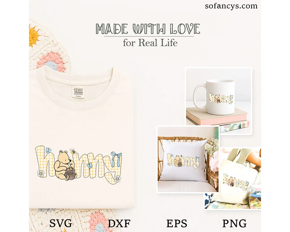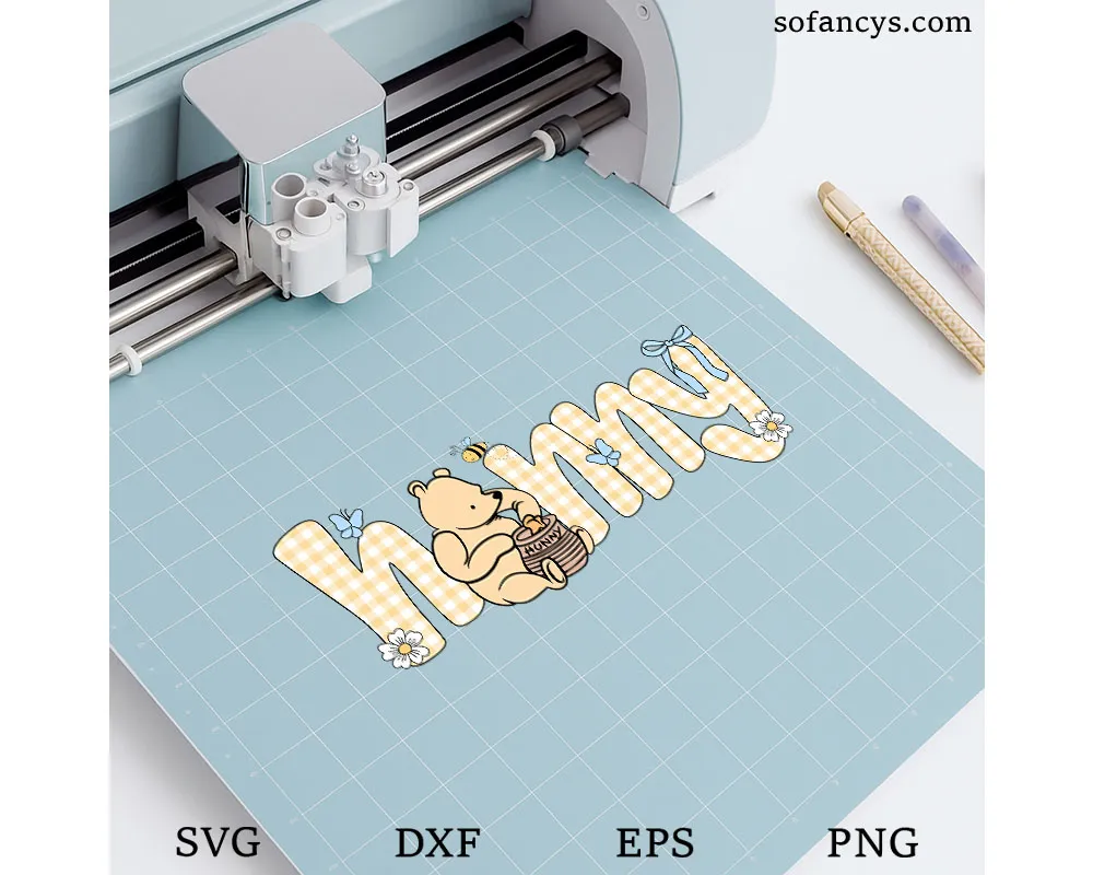 Sofancys proudly presents the Winnie the Pooh Mommy SVG – Cute Hunny Bear Mom Design, a sweet and heartwarming illustration perfect for loving moms. The design features an adorable honey-loving bear sitting beside the word “Mommy,” gently enjoying a jar of hunny while surrounded by butterflies, flowers, and soft pastel details. The charming plaid lettering and playful elements create a warm, cozy feeling ideal for family-themed crafts. Perfect for Cricut projects, shirts, tote bags, mugs, and Mother’s Day gifts, this SVG design celebrates motherhood with a touch of cute storybook charm.