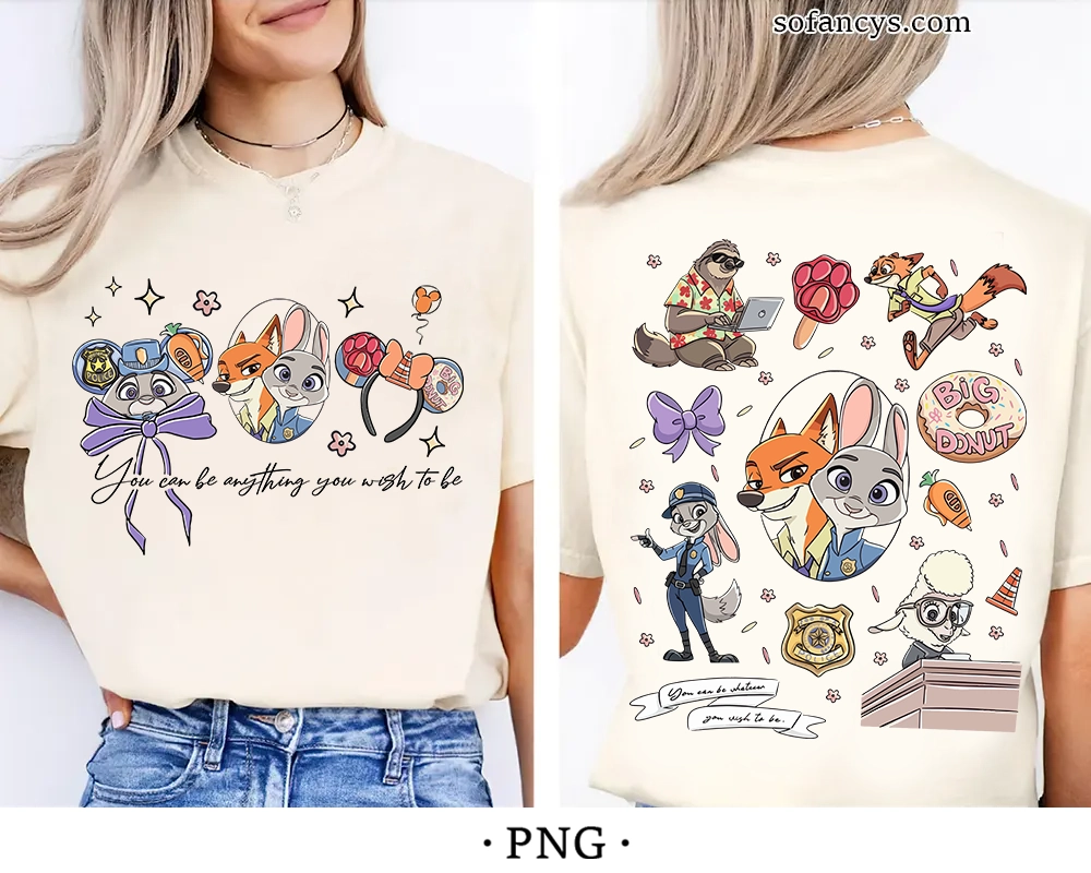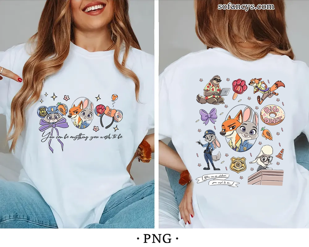 Sofancys proudly presents a vibrant and inspiring design featuring Judy Hopps, Nick Wilde, and beloved Zootopia characters in a playful front and back layout. From police badges and bows to donuts and fun character moments, every detail highlights the uplifting message of chasing your dreams. Bright colors and dynamic poses bring energy and charm to this artwork. Zootopia Characters PNG – You Can Be Anything Design is perfect for shirts, hoodies, tote bags, and creative DIY gifts for fans of this motivating animated story.