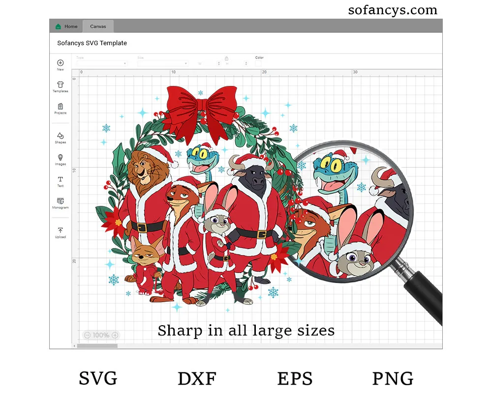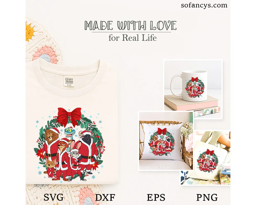 Sofancys proudly presents Zootopia Christmas SVG – Judy Hopps & Nick Wilde Santa Design, a joyful holiday illustration featuring beloved Zootopia characters dressed in festive Santa outfits. Surrounded by a classic Christmas wreath, sparkling snowflakes, and warm seasonal details, this design brings charm, fun, and togetherness to your holiday projects. Perfect for shirts, mugs, cards, stickers, and DIY crafts, it captures the cheerful spirit of Christmas with a playful animated touch fans will love.